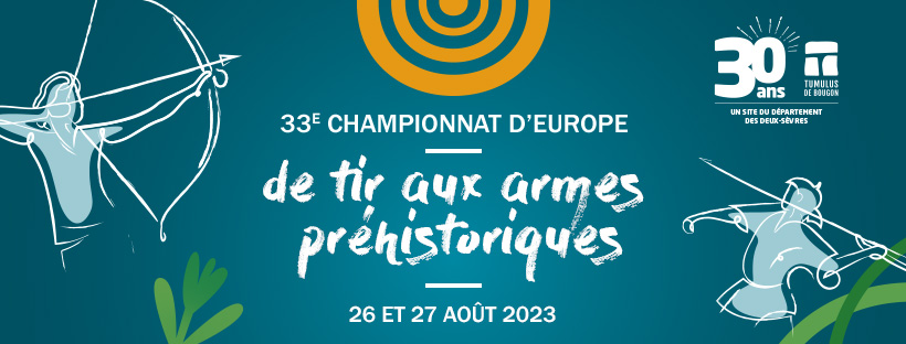 C’est avec plaisir que toute l’équipe du Musée des tumulus de Bougon vous convie à la manche du 33e championnat d’Europe de tir à l’arc et au propulseur préhistoriques qui aura lieu les samedi 26 et dimanche 27 août 2023 à Bougon. Vous retrouverez à cette occasion un parcours de 30 cibles, de circonstance en cette année 2023 qui marque le 30e anniversaire du musée !