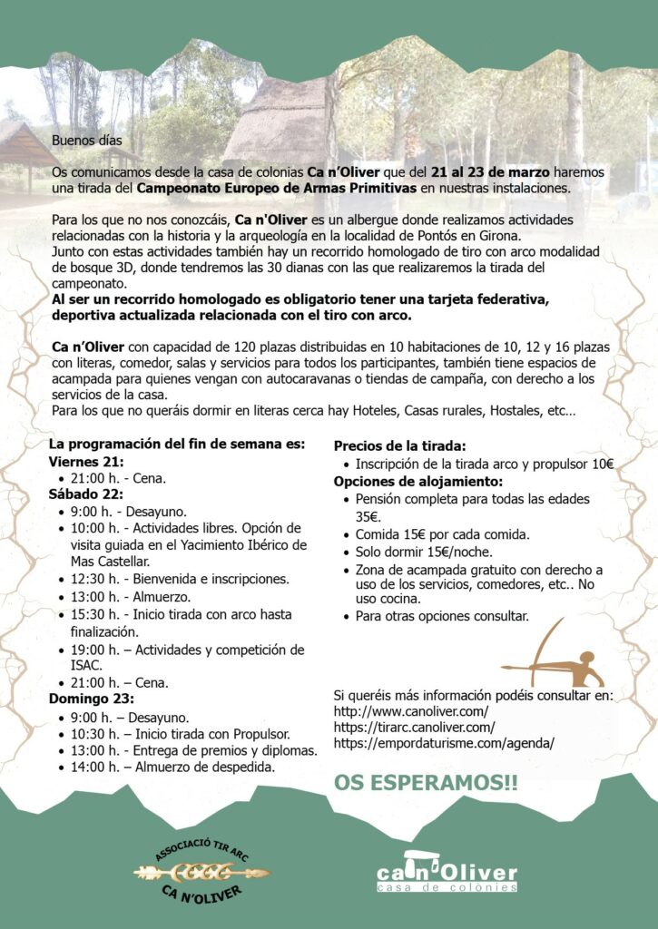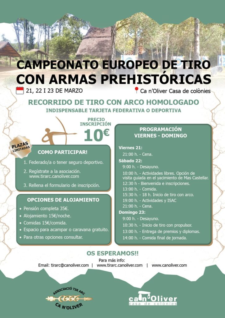 Hola us anunciem des de Associació Tir Arc Ca n’Oliver que els dies 21,22 i 23 de març farem una Tirada del Campionat Europeu d’Armes Prehistòriques.